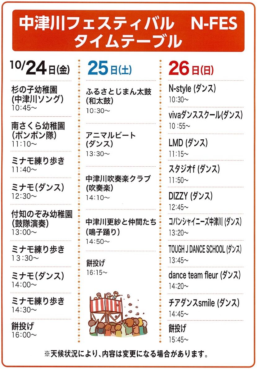 ふるさとじまん太鼓祭・キッズダンス・杉の子幼稚園(中津川ソング)南さくら幼稚園ポンポン隊・ミナモ(練り歩き・ダンス)・中津川吹奏クラブ・鳴子踊り等(予定)