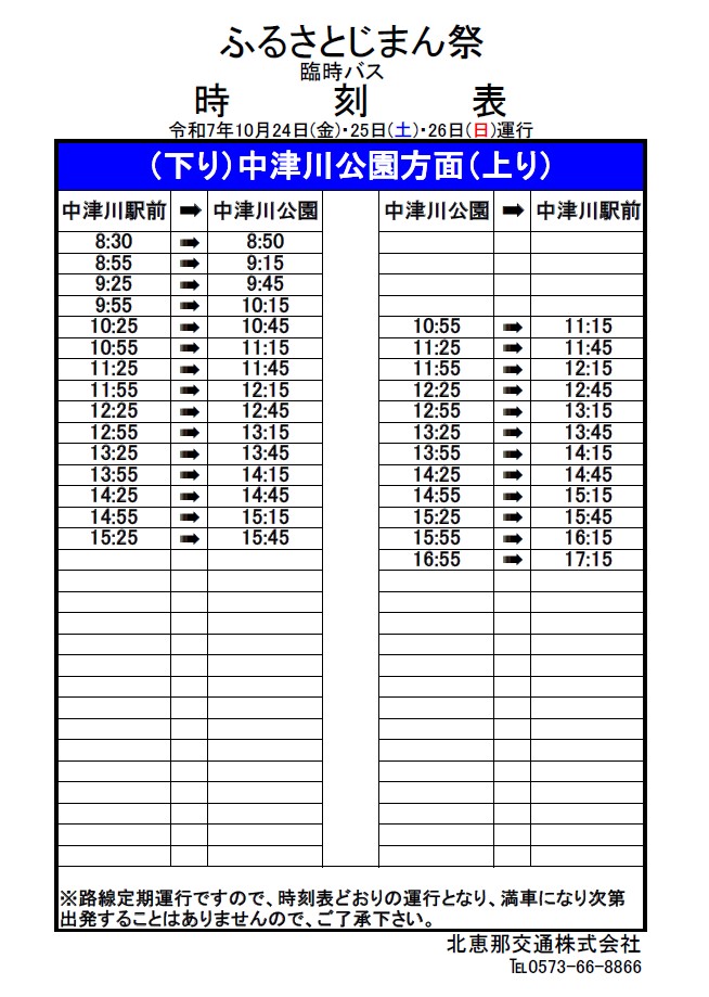 ・中津川公園内駐車場循環バスあります(土・日のみ)(9:00~17:00)